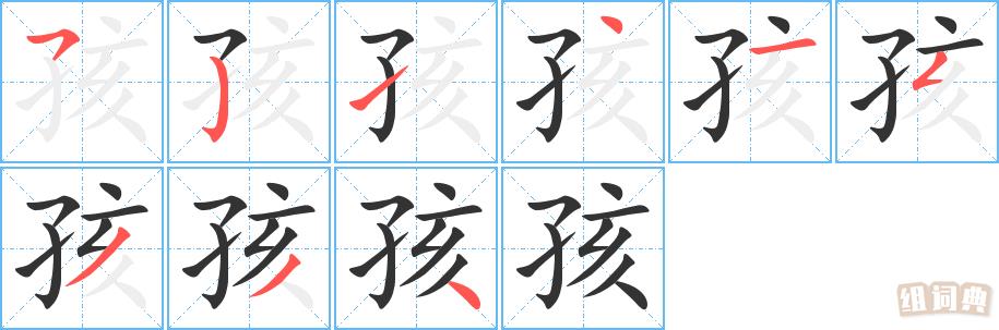 小儿笑。《说文解字.口部》:「咳,小儿笑也。……孩,古文咳从子。」《老子》第二○章:「我独泊兮其未兆,如婴儿之未孩。」 小儿、幼童。如:「孩童」。《后汉书.卷一三.隗嚣公孙述列传.公孙述》:「城降三日,吏人从服,孩儿老母,口以万数,一旦放兵纵火,闻之可为酸鼻!」晋.李密〈陈情表〉:「生孩六月,慈父见背。」